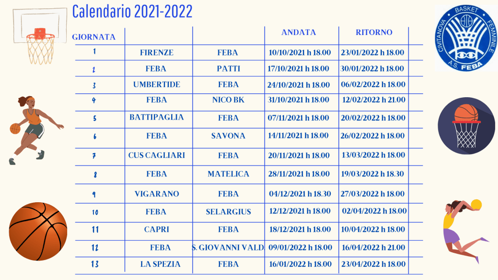 Il calendario vede le biancoblu aprire la regular season in quel di Firenze, domenica 10 Ottobre alle ore 18.00, mentre la prima sfida casalinga sarà contro Patti la domenica seguente, alle ore 18.00. L’8° giornata vedrà la Feba impegnata nel derby contro il Matelica, il 28 Novembre alle ore 18.00 in casa, mentre l’ultima sfida pre natalizia è fissata per il 18 dicembre quando le momò andranno in quel di Capri. Il girone di andata si chiude il 16 gennaio, alle ore 18.00, con la trasferta a La Spezia mentre la regular season avrà termine il 23 Aprile, sempre contro le liguri.