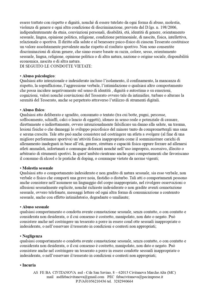 Ai sensi del D.Lgs. n. 38/2021 (art.16) e della delibera CONI 25 luglio 2023 (art. 3) e dei Principi Osservatorio CONI agosto 2023 (art. 4 e 8) si comunica la nomina del responsabile al “SAFEGUARDING” ( RESPONSABILE DI PREVENZIONE ABUSI, VIOLENZA E DISCRIMINAZIONI) nella persona di Sergio Delli Carri. Di seguito la scheda informativa.
